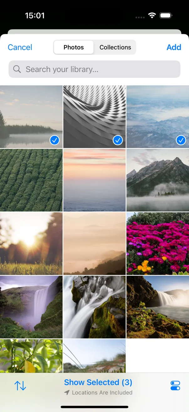 Choose up to 20 photos from your camera roll. Pick from 3 image quality levels.